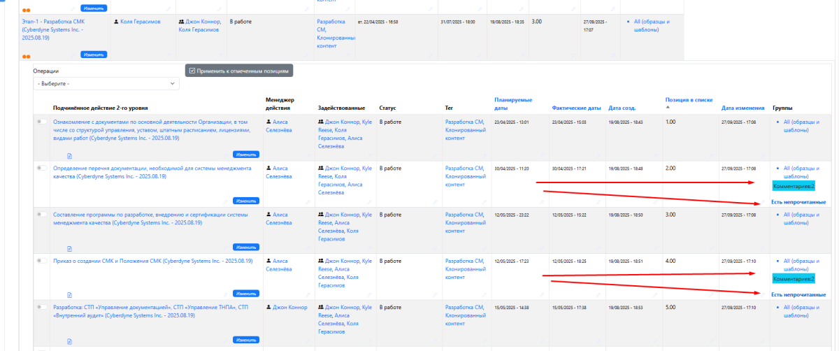 В таблице действий счетчик комментариев автоматически отображает их количество и все комментарии, которые пользователь еще не прочитал. Функция особенно будет полезна администраторам и участникам проектов для отслеживания обсуждений и оперативного обмена информацией по каждому из них.